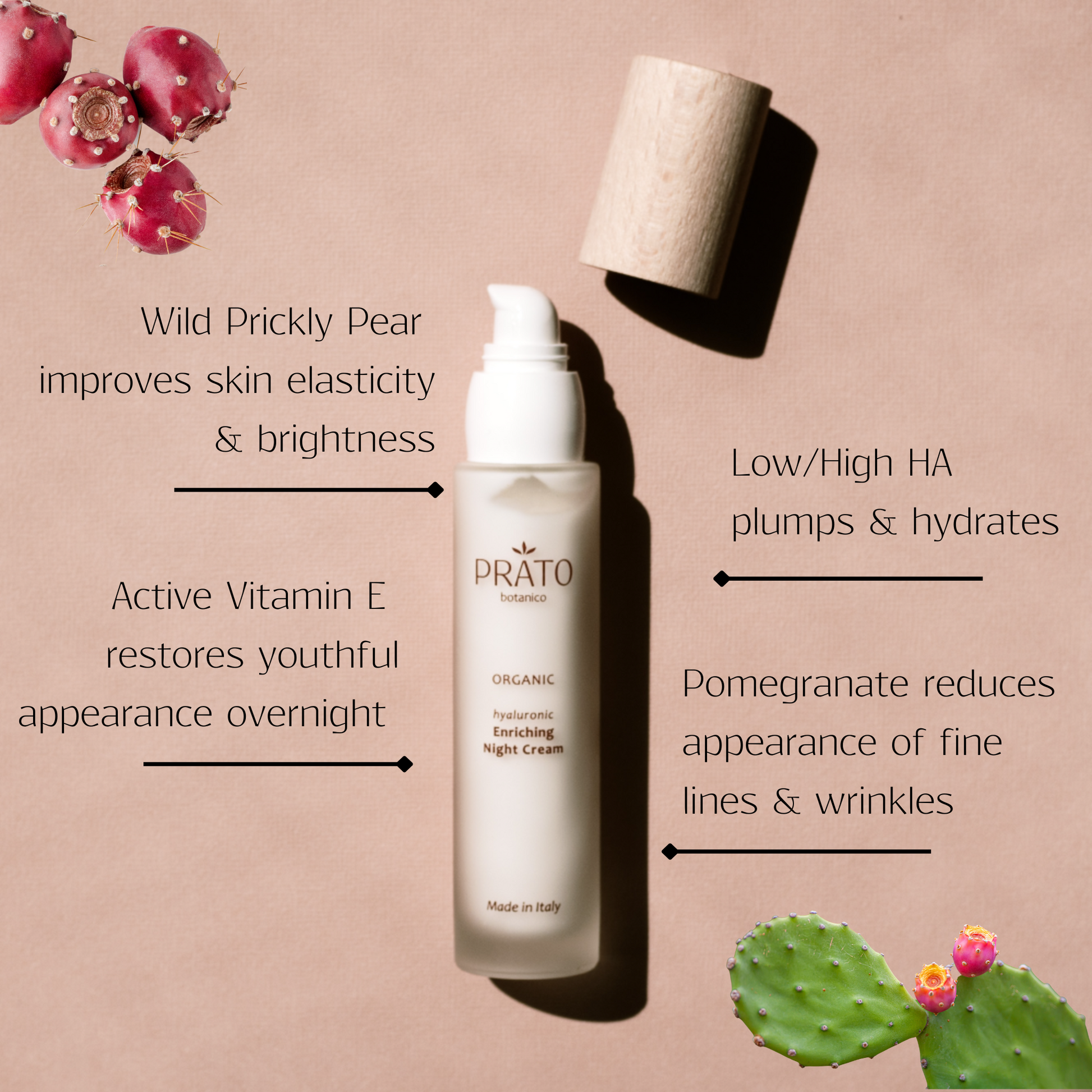 Each one of us suffers from different skin problems, whether it's acne, hyperpigmentation, irritated skin, dark circles, or dryness. The organic night cream of Prato Botanico is enough to get rid of these issues. At night, the skin is more porous and open to receive nutrients. This is why it is important to make it a habit to use our Enriching Night Cream, which has ingredients to solve your skin problem.
